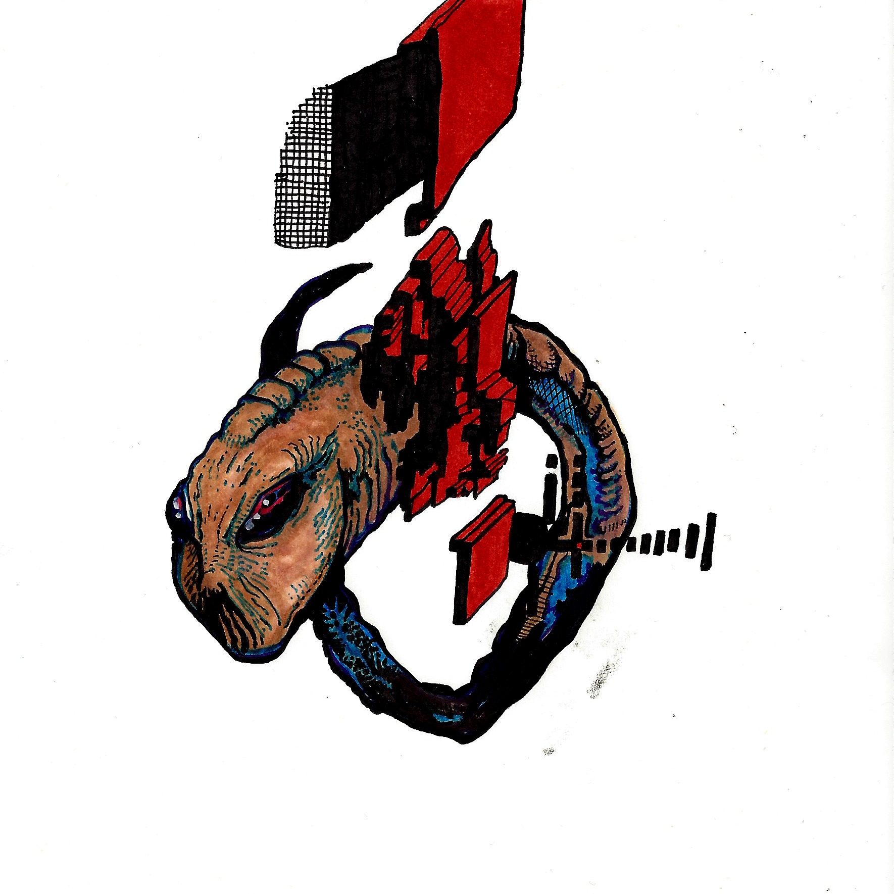 The Spacecruiser Rhinoceros hovered in orbit outside the planet. Inside the ship Delt Kangis was in his seat gazing at the expanse of space outside the window of his chambers. He was a lanky creature, wearing a black speedo, leather gauntlets and boots. His face was plain with gaping red eyes, nose and mouth hidden beneath a layer of wrinkled skin.